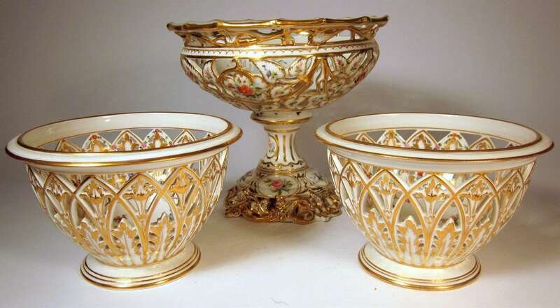 Comprising a centerpiece together with two footed bowls, the reticulated bodies worked to show floral sprays and gilt highlights.