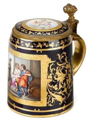 Good Dresden gilded, gilt metal mounted cobalt ground porcelain tankard early 20th century