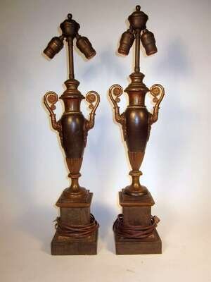 Classical form, with scrolling gilded handles over raised square plinth base, converted to lamps.