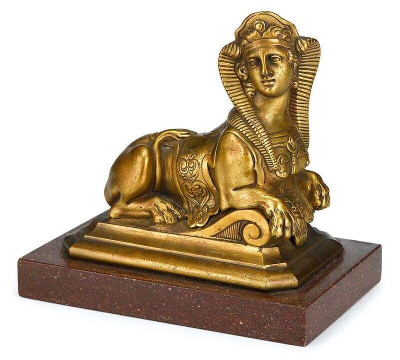 Typical form, the female head wearing an Egyptian headress, lion form body, raised on rectangular rouge marble base.