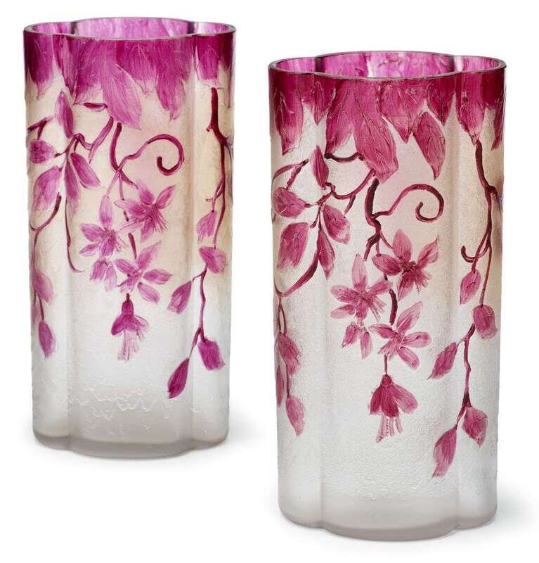 Pair of French Legras pink painted glass vases signed legras
