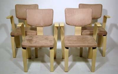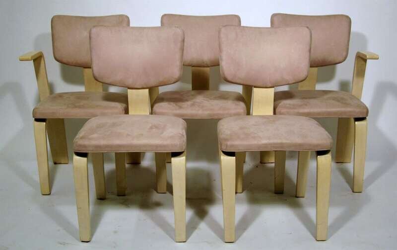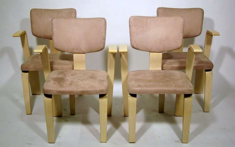 Comprising seven armchairs and two side chairs, each with suede upholstered back and stuff over seat, the armchairs with curved arms, raised on conforming legs.