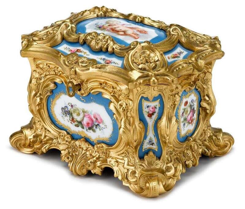 Shaped rectangular form, the cover inset with a porcelain plaque painted to show a cherub on blue ground, the sides inset with floral painted porcelain plaques, raised on conforming base and scroll feet.