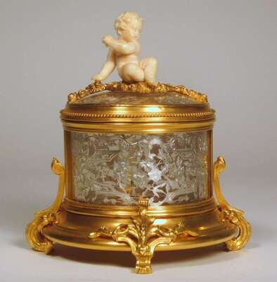 Cylindrical form, the hinged cover with associated ivory putti finial, the sides and cover double glazed containing silver foil worked to show strapwork and floral scrolls, over conforming base raised on foliate cast scroll feet.