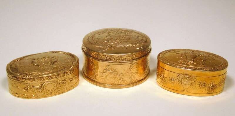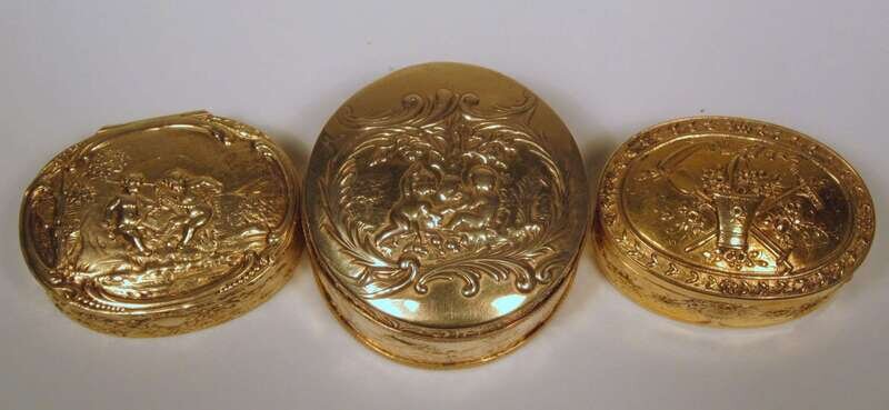 The largest of circular form with pressed putti to cover, together with two oval boxes of similar design, all stamped 800.