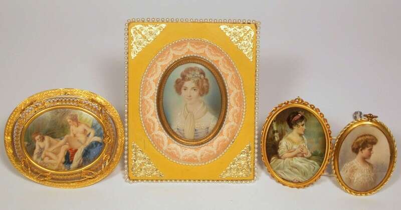 Three portrait plaques depicting ladies, the other nude bathers, various forms and mediums, in gilt metal frames.