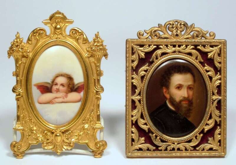 Oval plaques, one depicting a cherub, the other a bearded gentleman, within conforming gilt metal frames.