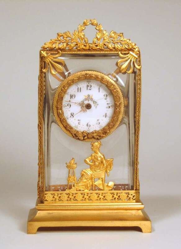 Rectangular form, the case overlaid to show a seated neoclassical lady, surmounted by a wreath, enclosing a white enameled dial highlighted with gilt dots, raised on bracket base.
