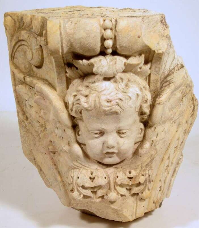 Carved to show a child's face flanked by wings, the whole carved to show ribbons and floral sprays.
