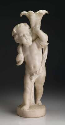 Carved to show a standing Putti supporting a cornucopia, over circular base.