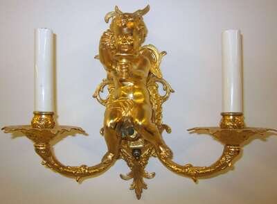 Each cast as a seated Putti issuing twin candle arms.