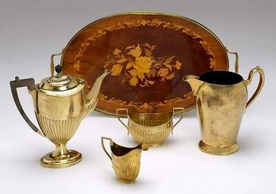 Comprising a large coffee pot, creamer and sugar bowl, with wooden handle and finial; together with an associated marquetry tray and gilt washed silver plated jug. (5).