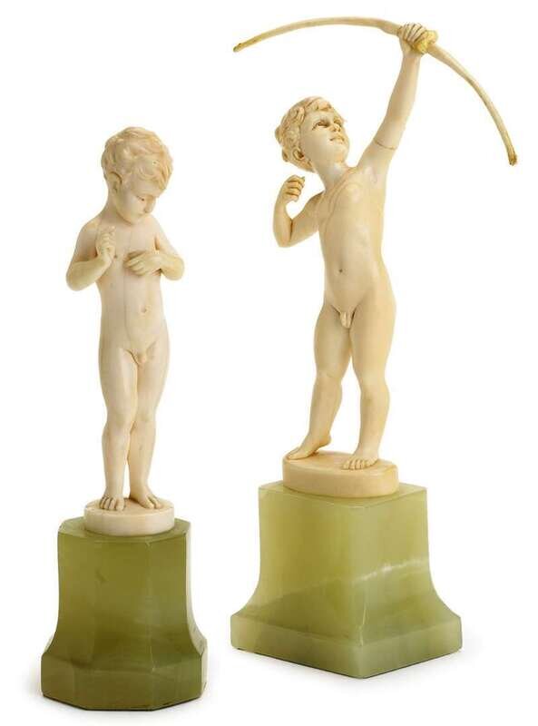 Both standing nude models of young boys, one with bow drawn.