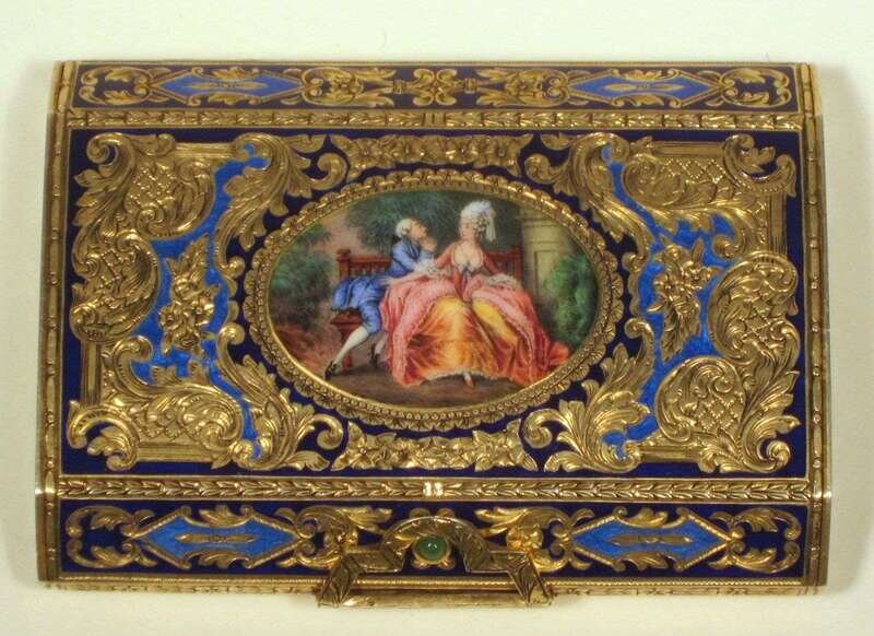 Faceted rectangular form, the cover centered with oval medallion depicting couple in embrace, over chased and enameled ground, stamped italian 800.