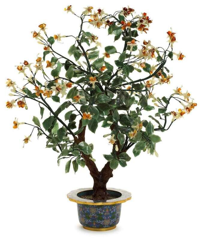 The cylindrical enameld jardiniere issuing a profusion of branches and hardstone leaves.