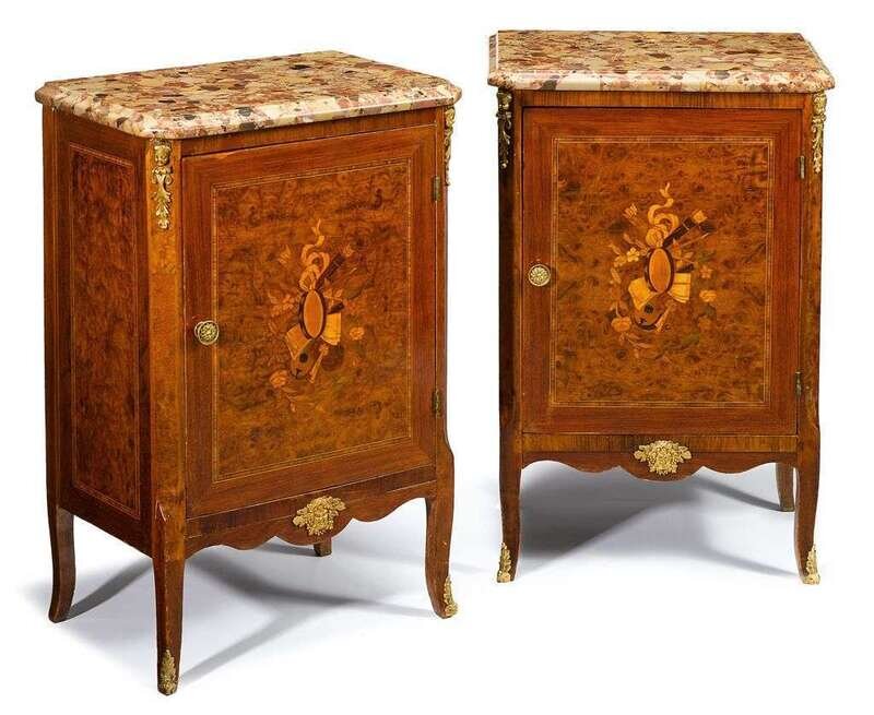 The molded rectangular marble top with canted corners over a conforming case with single cupboard door, the door centered by burl walnut panel with marquetry depicting musical instruments, ribbons, and foliage, above a shaped apron centered by a bacchic bronze mount, over short square cabriole legs, terminating in cast sabots.
