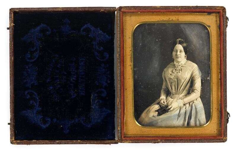 Circa 1849, quarter plate daguerreotype in original brown leather embossed case with elliptical brass mat.