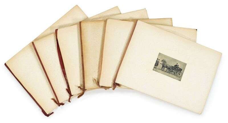 1890, each with twelve cardstock pages, three photographic reproductions mounted on each page of various notable literary and artistic figures including: Hugo, Toulouse-Lautrec, Baudelaire, Rimbaud, Braque & Gauguin. Pages held in binding by silk ribbon tied at spine. Published in numerous printings between 1890 and 1950.