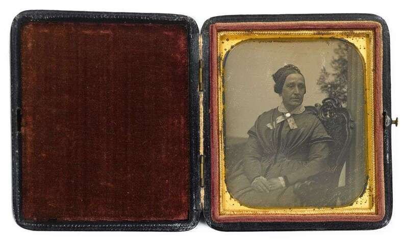 Circa 1848, sixth plate daguerreotype in period black leather case with elliptical brass mat.