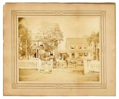Albumen print depicting women and children in front of a home with horse and carriage.