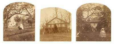 Circa 1859, three small salt prints depicting home exterior and women in the garden. Pencil dated on verso.