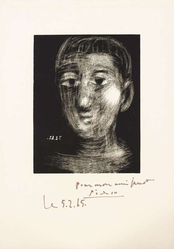 1962, pencil signed, dated 'Le 5.2.65' and dedicated 'pour mon ami Janot.' bottom right, proof apart from the signed and numbered edition of 50, with wide margins; Galerie Louise Leiris, Paris, publisher. Linoleum cut on Arches.