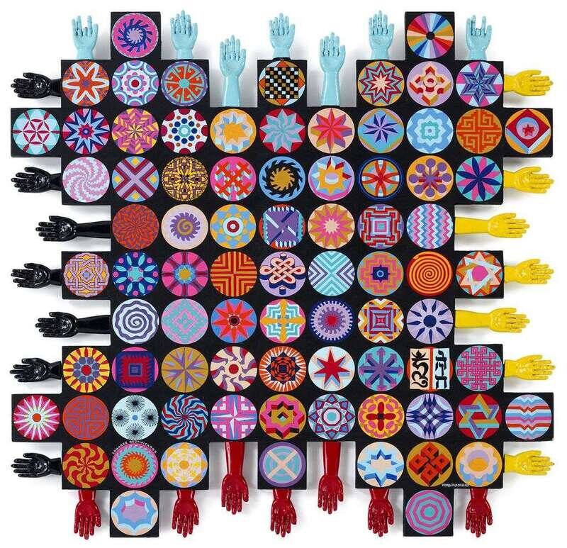 Signed bottom right, acrylic on wood with painted and sculpted hands