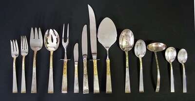 "Golden Scroll" pattern, comprising ten dinner forks, ten salad forks, ten hollow handle dinner knives, ten hollow handle butter spreaders, twenty-one teaspoons, ten tablespoons, one sauce ladle, one serving spoon, one salad serving set, one cold meat fork, one hollow handle carving set, and one hollow handle pastry server.