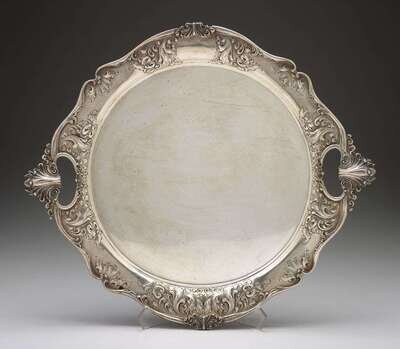 Of circular form with a scalloped edge, acanthus scrolled handles, and a cartouche, scroll, and foliage decorated border.