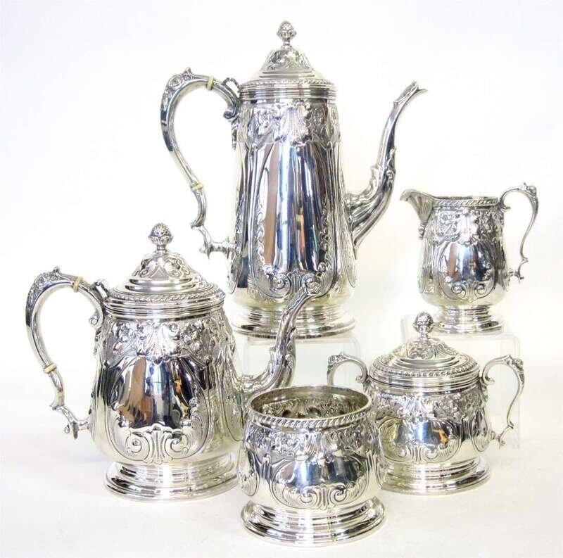 Including hot water pot, tea pot, covered sugar bowl, creamer and waste bowl, pineapple finials to lids, large floral and scroll reserves to sides, chased and curved spouts, lyre form handles with bone insulators on circular molded plinths.