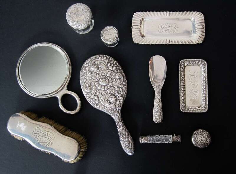Various patterns comprising hand mirrors, two pin trays, cosmetic jars, shoe horn, and a clothes brush.