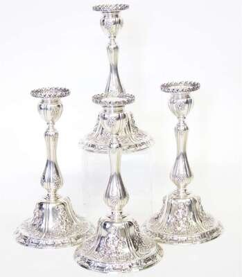 Circular leaf gallery to bobeches, candle holder and shaft with groups of repousse flowers, the circular bases with figural and floral repousse reserves, leaf bases.