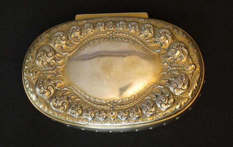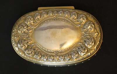 Oval shape, lid with repousse border of leaves, body with "S" line repousse decoration.