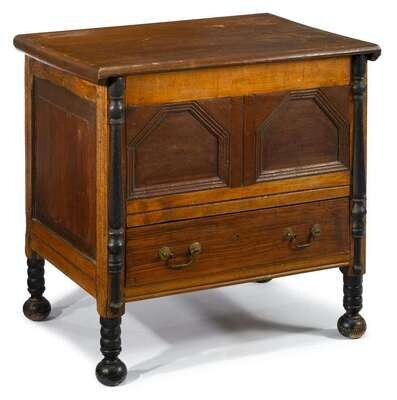 Rectangular lift lid on paneled case fitted with single drawer flanked by applied balusters, turned feet.