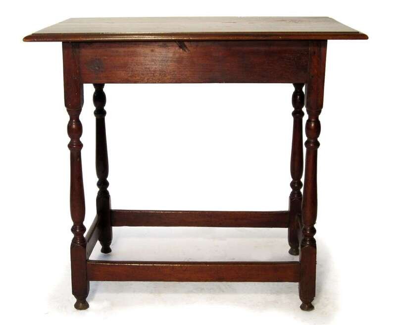 Rectangular molded edge top on a straight apron and baluster turned legs joined by stretchers.