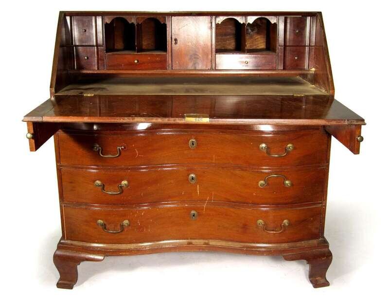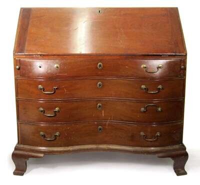 Slant top opens to a fitted interior above case with oxbow fronted drawers, ogival bracket feet.