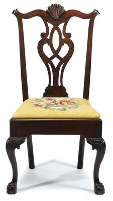 The serpentine crestrail centered with a carved scallop shell and scroll carved volutes, pierced vasiform splat, molded trapezoidal seat, stylized leaf carved cabriole legs ending in ball and claw feet.