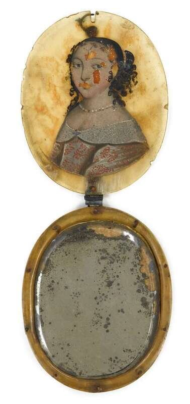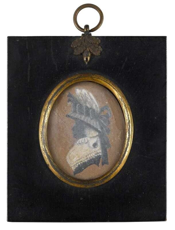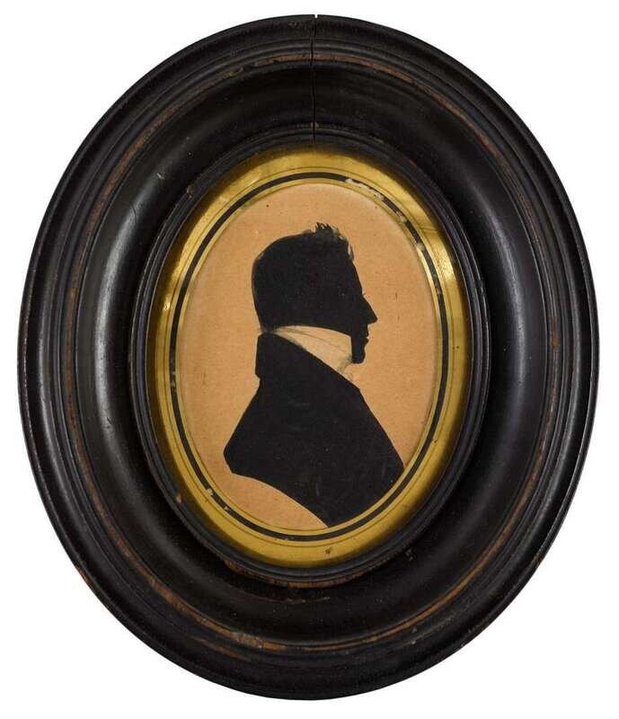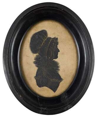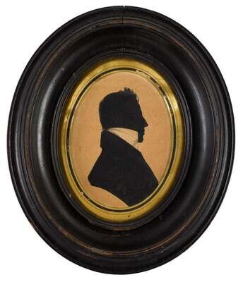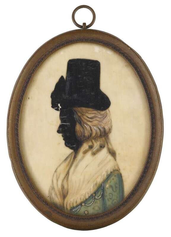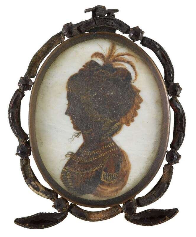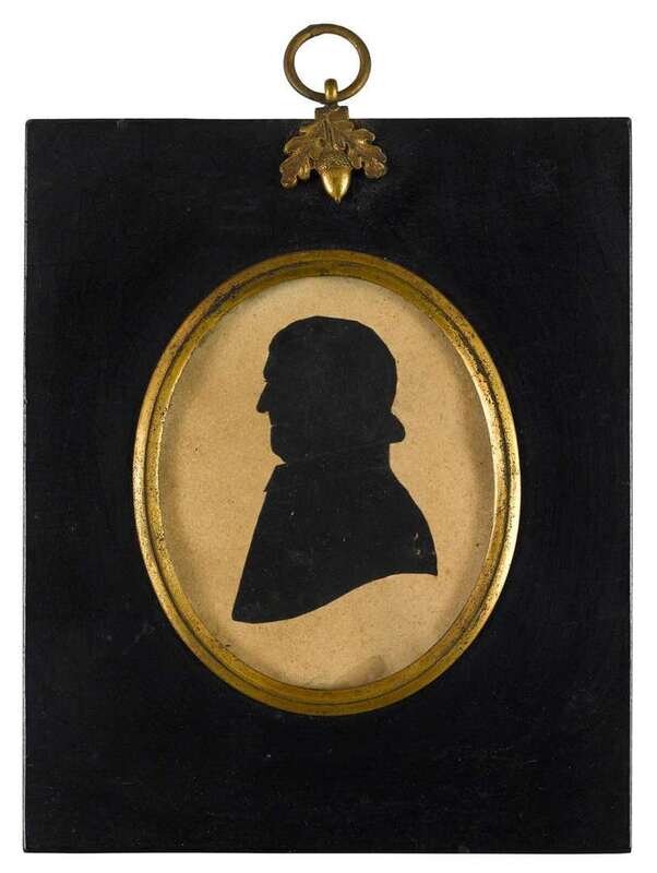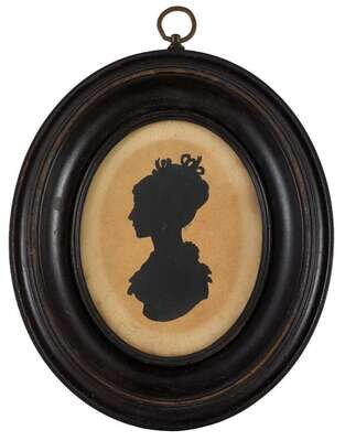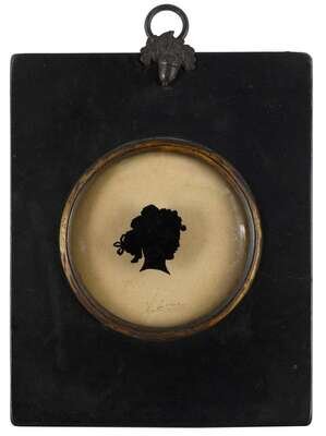 Including nine silhouettes, variously worked: one reverse painted on glass, one painted on plaster, six on paper, three having watercolor and gilt highlights, one in sepia and gilt; together with a polychromed silhouette on ivory and a miniature portrait on ivory of a lady worked in grisaille, and another portrait painted on tortoise shell.