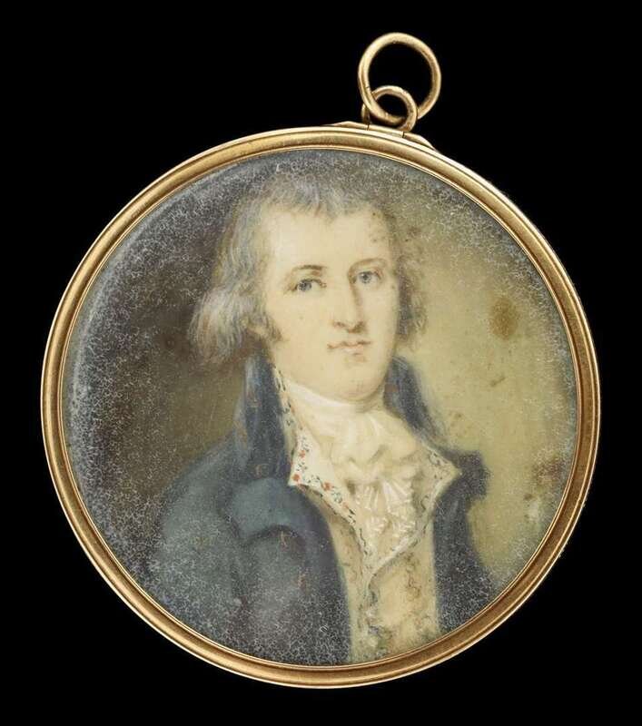 Watercolor on ivory, circular gilt locket frame, glazed back with braided hair.