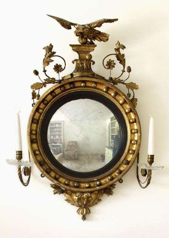 Eagle with outstretched wings on plinth flanked by leaves and acorns above molded frame with spherules, candlearms, leafy pendant.