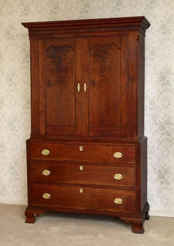 The cove molded cornice above two recessed paneled doors enclosing three shelves above base fitted with three drawers, flanked by fluted sides, bracket feet.