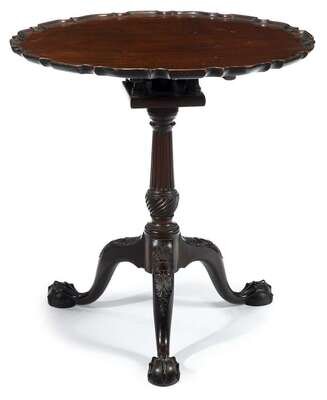 Shaped molded top on birdcage and fluted and urn turned shaft on carved cabriole legs ending in ball and claw feet.