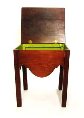 Rectangular hinged top, deep shaped apron, straight molded legs.