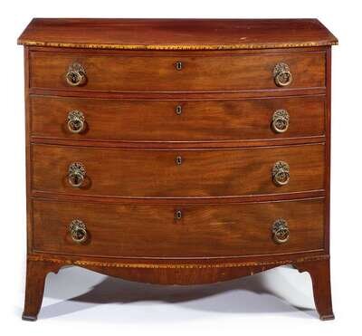 Federal inlaid mahogany bow front chest of drawers in the manner of john and thomas seymour, boston, ma, circa 1800