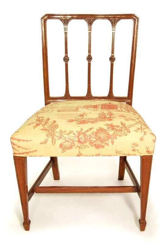 Squared molded back above three carved verticals on an overupholstered seat and molded tapering legs ending in spade feet.
