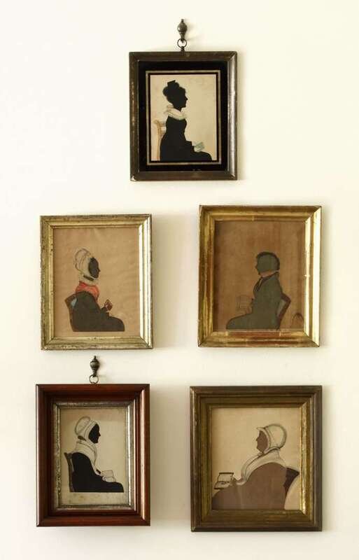 Including four ladies and a gentleman, each depicted in 3/4 seated position, cut-out heightened with graphite, watercolor and ink, framed.