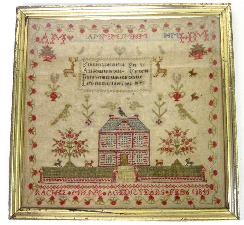 Needlework sampler "rachel milne aged 12 years feb 6, 1845"