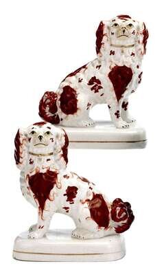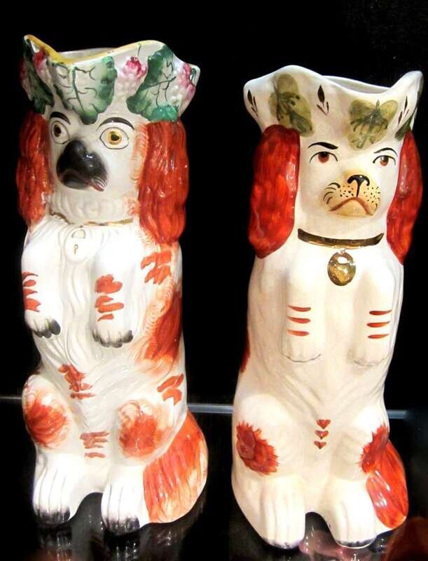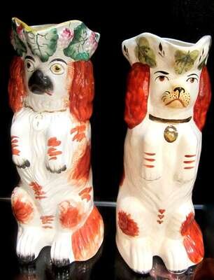 Includes spaniel form pitcher with grape vines on tricorn hat and pair of spaniels on oblong bases; together with another spaniel form pitcher of 20th century make.