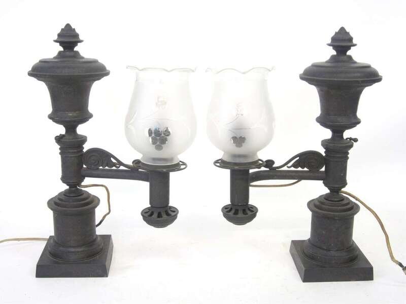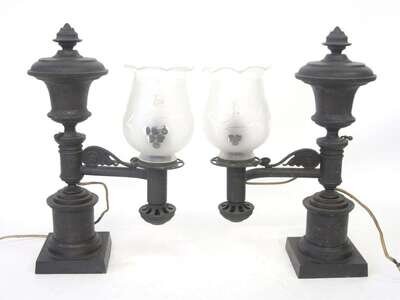 Urn form on cylindrical stem and base with scrolled arm, electrified.