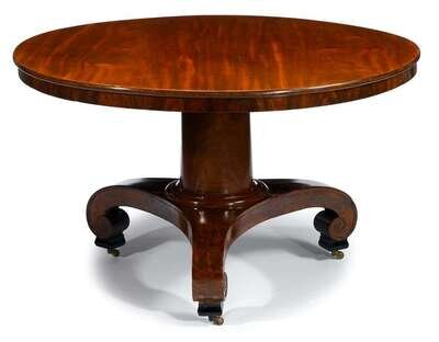Circular top with conforming apron tilts on columnar post on scrolled tripod base.